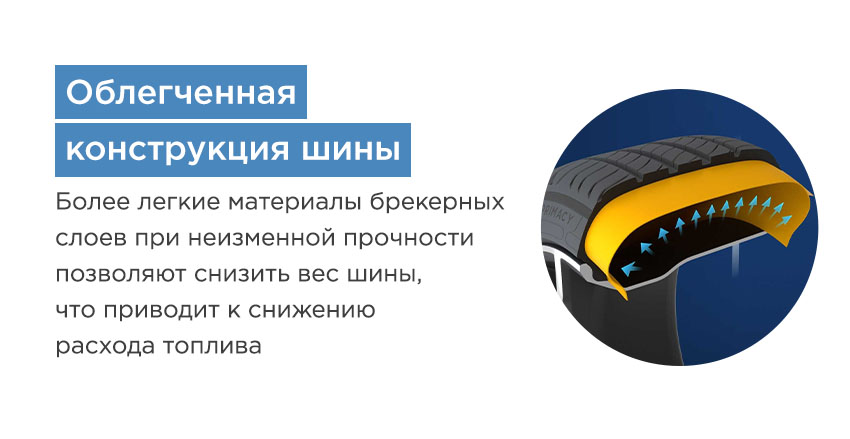Брекерные слои этих шин изготавливаются из инновационных лёгких материалов, которые, тем не менее, характеризуются высокой прочностью.