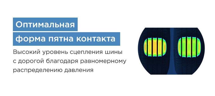 Оптимальная форма пятна контакта обеспечивает максимально надёжное «прилипание» шины к дорожному полотну для более равномерного распределения давления при торможении, ускорении и маневрировании.