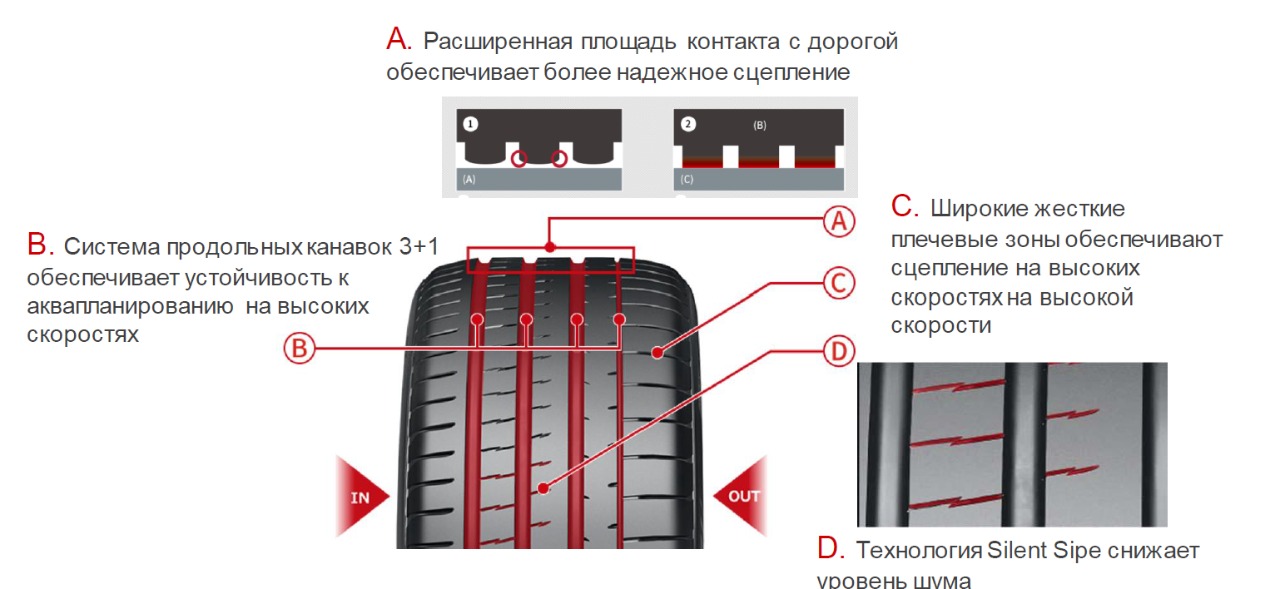 - Оптимизация шага протектора и распределения блоков в совокупности с технологией Silent Sipe способствует уменьшению резонансных шумов, сохраняя премиальный уровень акустического комфорта.